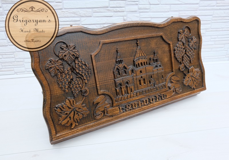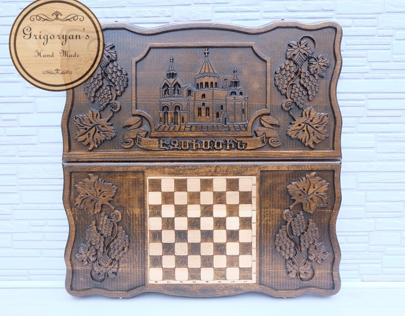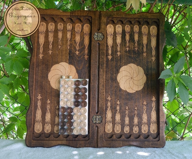 Carved beech backgammon. The set includes: 32 game figures made of beech wood, the reverse side of the figures is covered with velvet fabric.