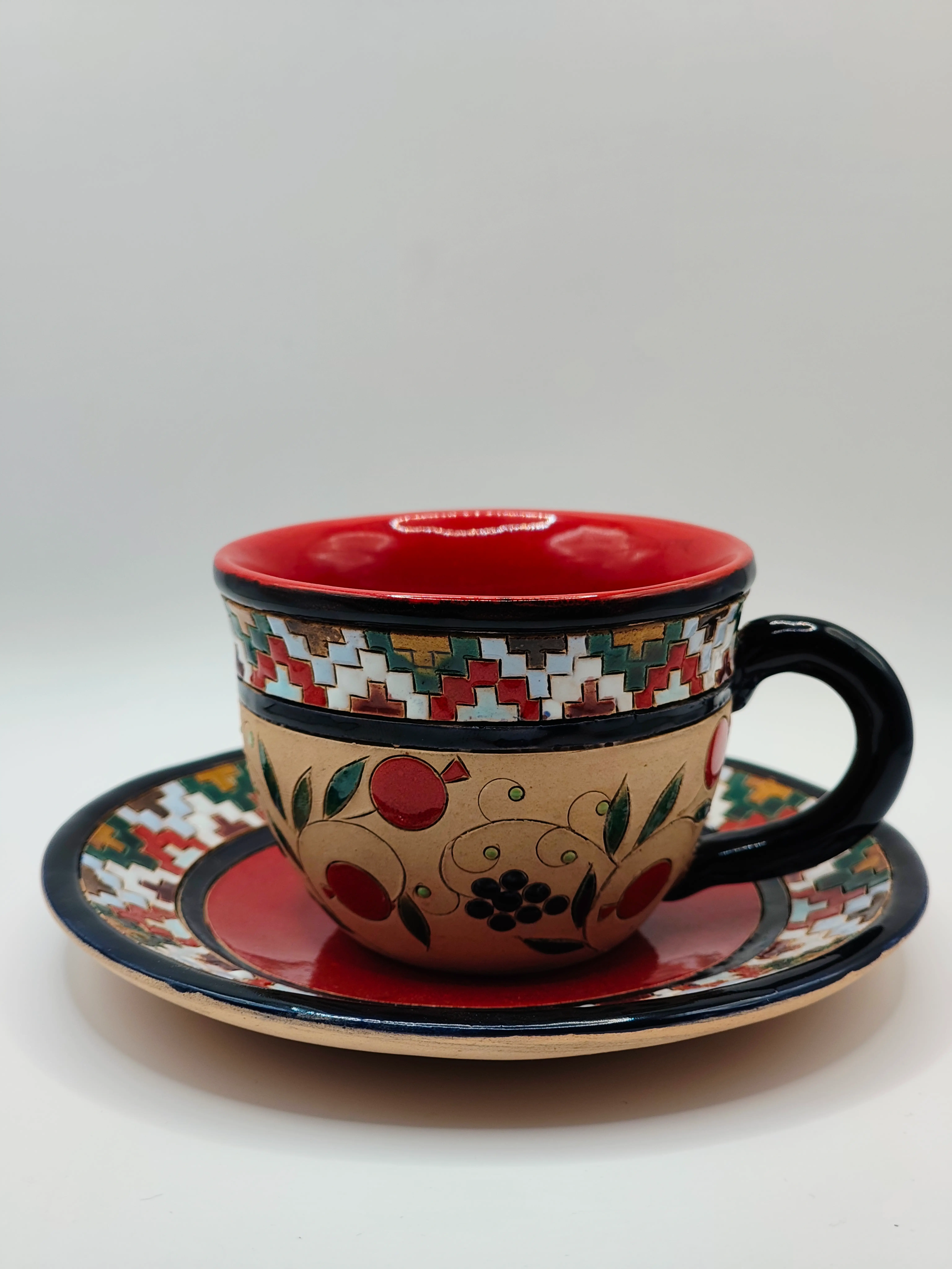 Ձեռագործ, կերամիկ թեյի բաժակ իր ափսեով։
