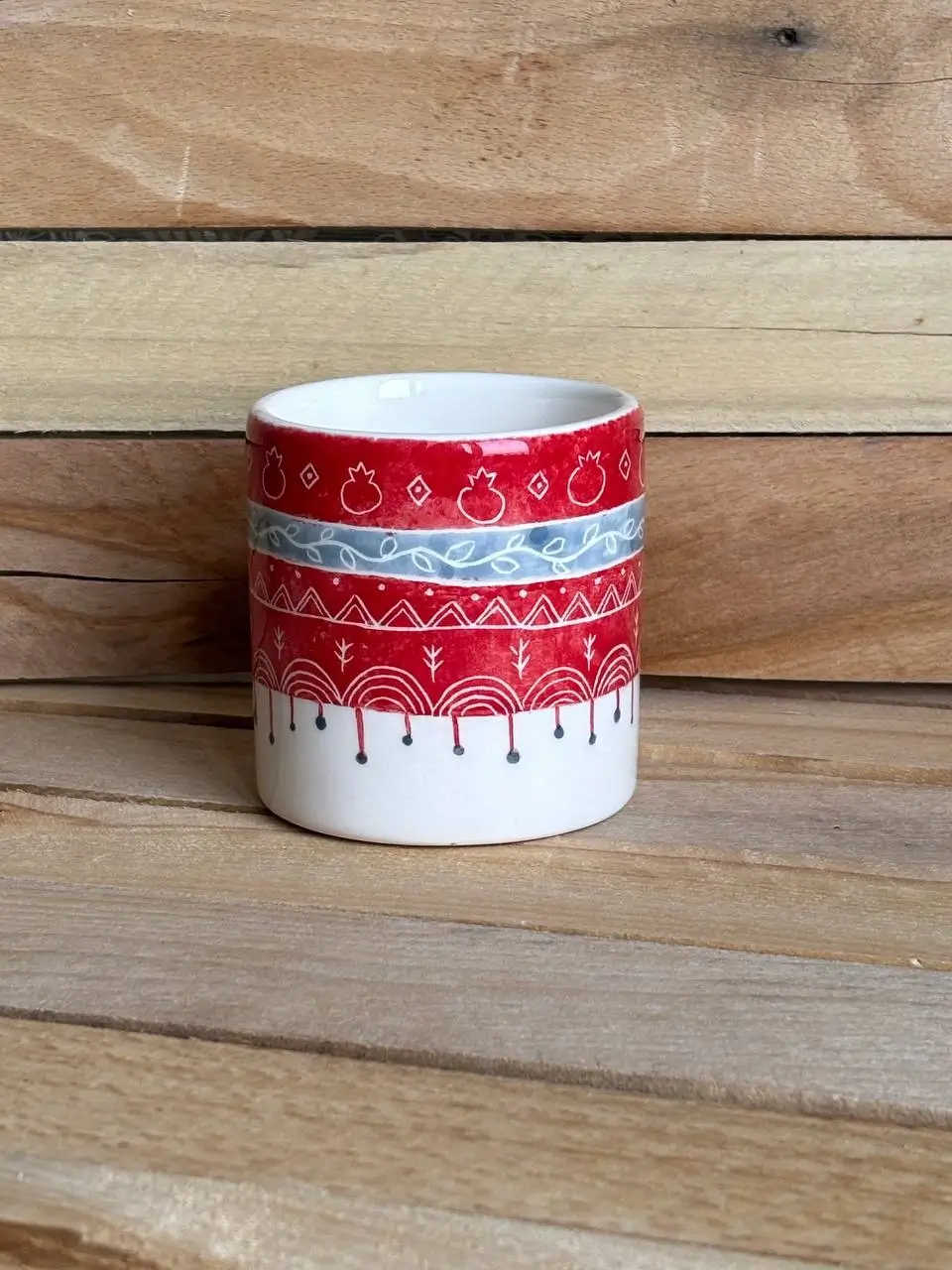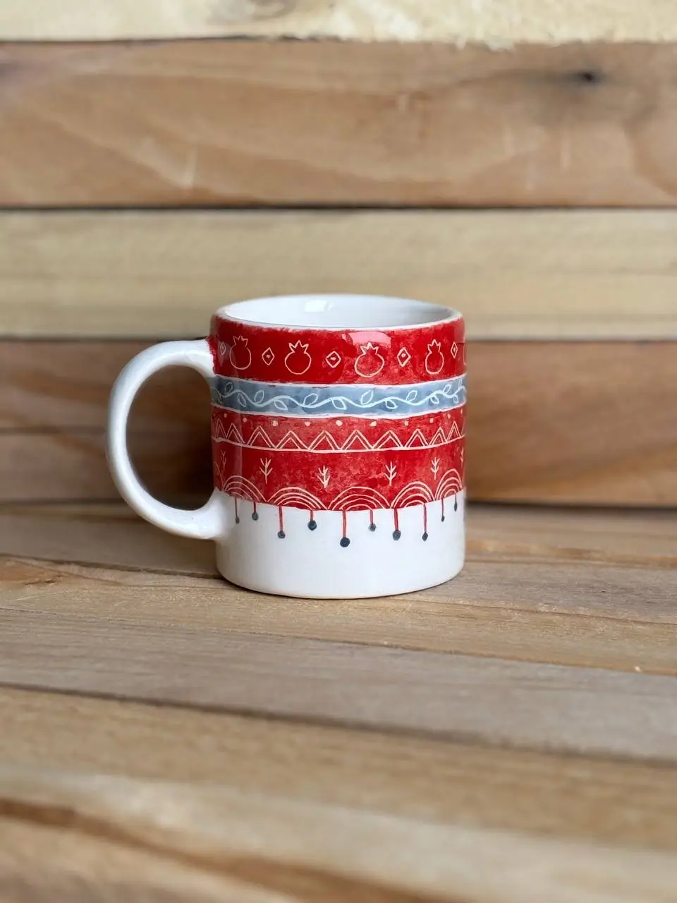 Բացառիկ ձեռագործ կերամիկական բաժակ՝ նռան ներշնչված կարմիր զարդանախշերով․ ջերմ, անկեղծ և լի կենսական զգացողությամբ՝ առօրյա ըմպելիքների համար