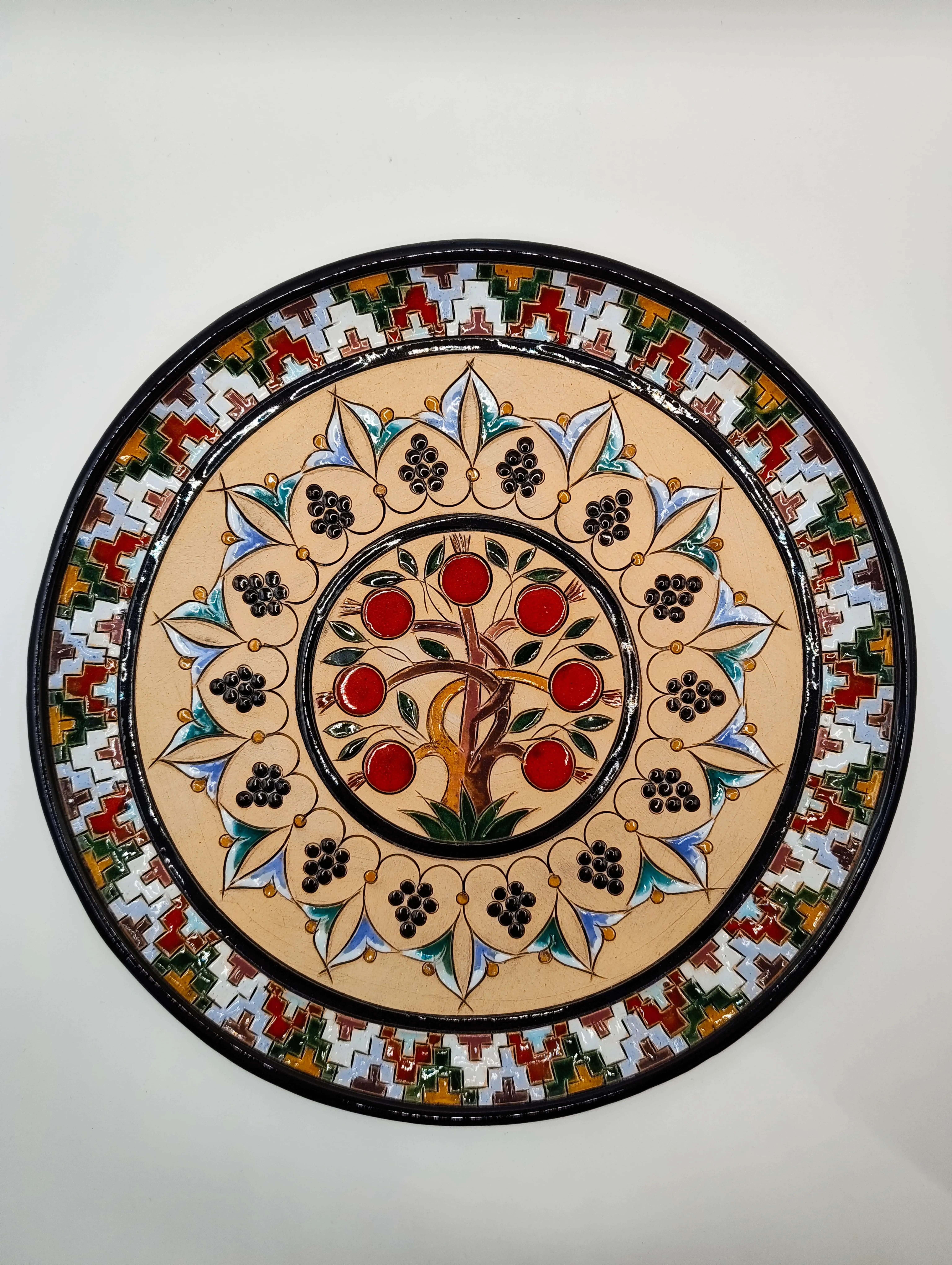 Գեղեցիկ ձեռագործ կերամիկ ափսե նռան և խաղողի զարդանախշերով։