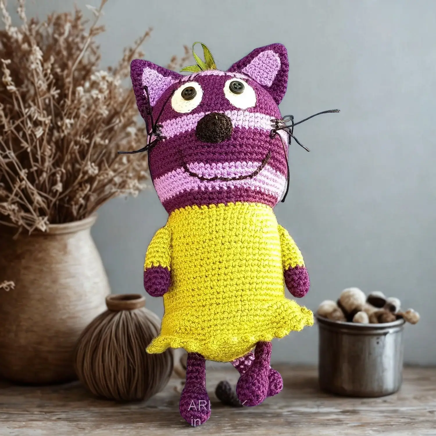 Գեղեցիկ ձեռագործ կատու մանուշակագույն երանգով։ Արտացոլում է ուրախություն և գունավոր հմայք։