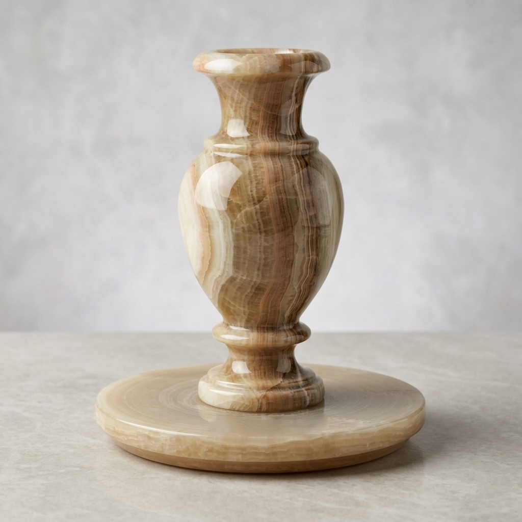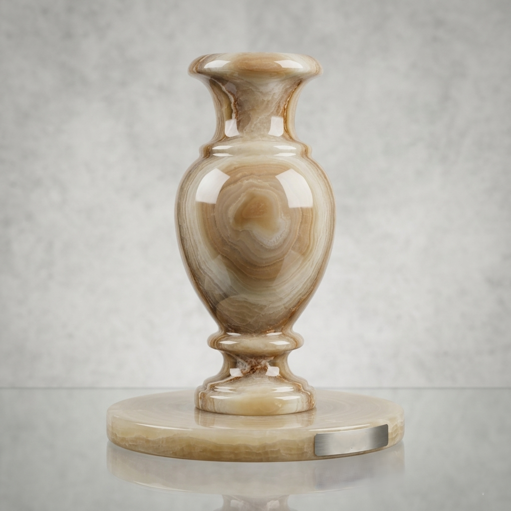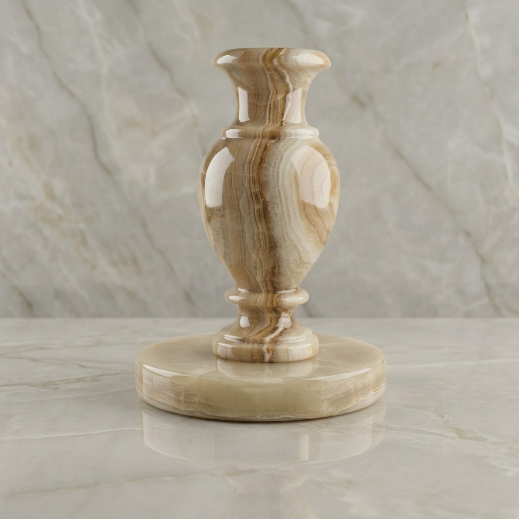 Բնական շերտավոր օնիքսից պատրաստված այս նրբաճաշակ ծաղկամանը հիանալի հավելում է ցանկացած ինտերիերի համար: Քարի բնական նախշերն ու տաք երանգները յուրաքանչյուր նմուշ դարձնում են եզակի: Ծաղկամանն ունի հղկված փայլուն մակերես և կայուն կլոր հիմք, ինչը հաղորդում է շքեղություն և դասական ոճ ձեր տանը կամ գրասենյակին: