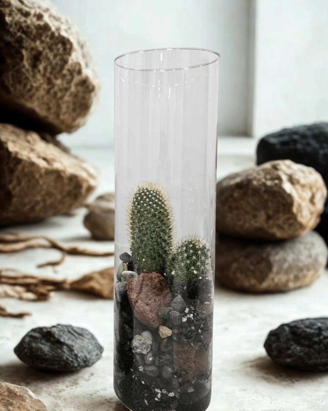 Անապատի ոճով բույսերի դասավորություն՝ եզակի հյութաբույսերի տեսակներով։