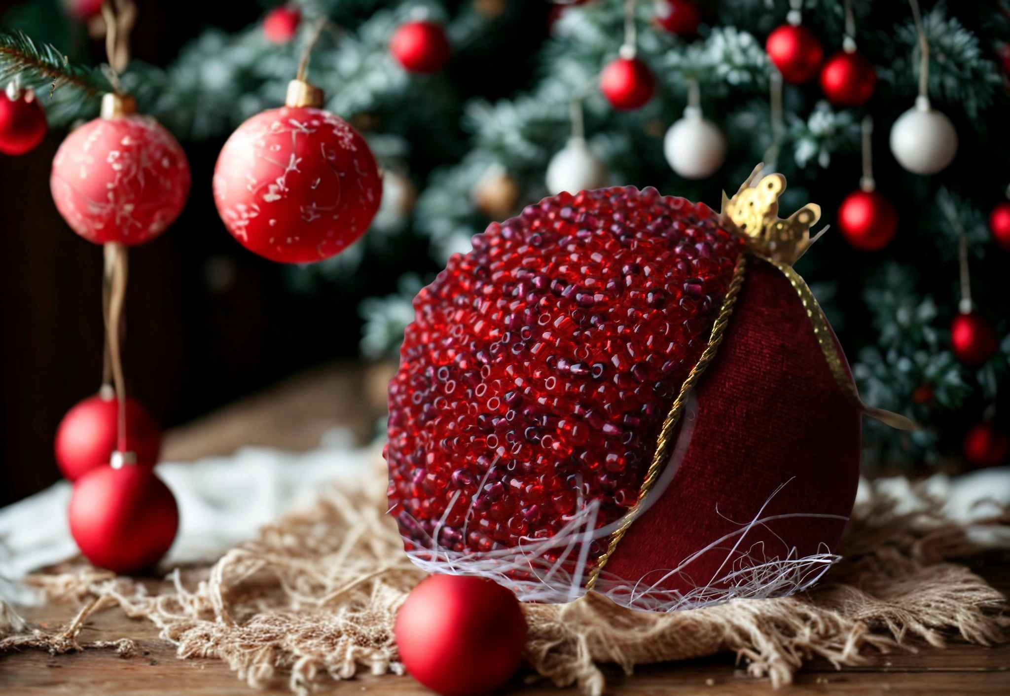 Էլեգանտ ձեռագործ գնդիկ՝ կարմիր և ոսկեգույն երանգներով։ Հատուկ փայլ տոնական ծառի համար։