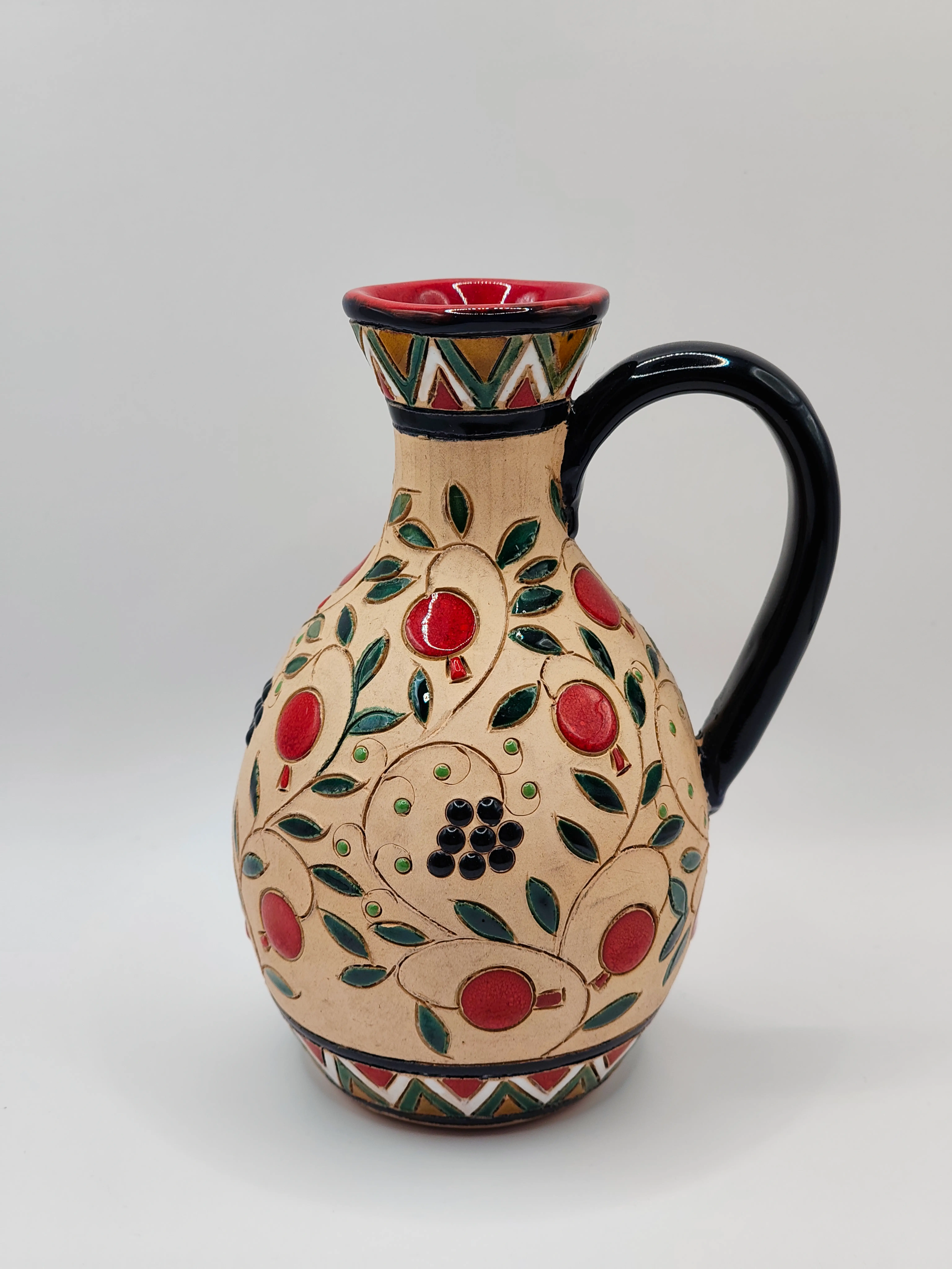 Керамический кувшин, украшенный традиционными узорами и натуральными цветами, с удобной ручкой. Это идеальное сочетание функционального и декоративного объекта. Идеально подходит для подачи напитков или в качестве красивой витрины на полке или столе.