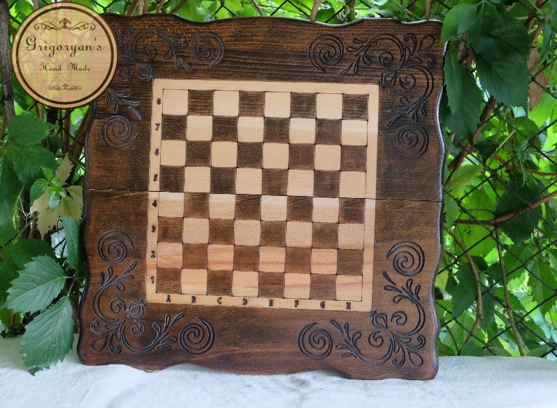 3 игры на одной доске (шашки, нарды, шахматы), вырезанные из древесины бука.